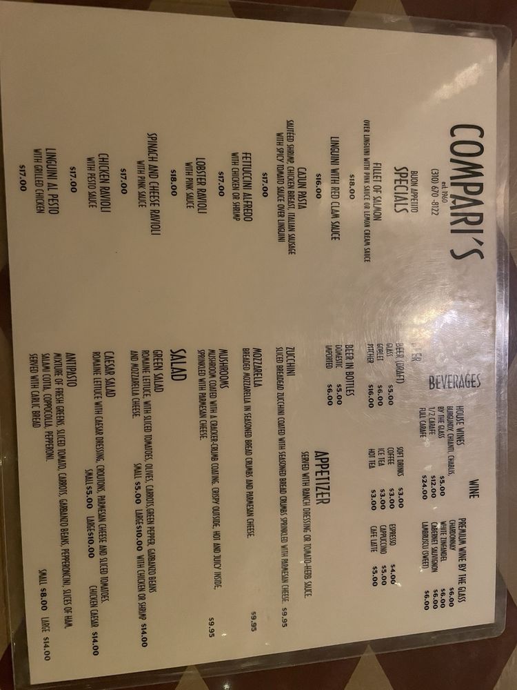 Welcome to Compari’s, your cozy Italian haven located at 5490 W Centinela Ave, Los Angeles. This restaurant perfectly marries a casual, intimate atmosphere with delicious, affordable cuisine. The menu features daily specials like Cajun Pasta and Lobster Ravioli, all priced around $12, each served with a side salad and garlic toast to elevate your dining experience.